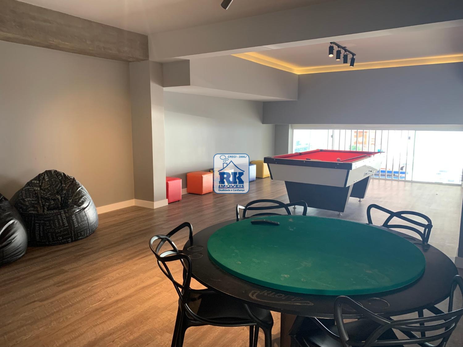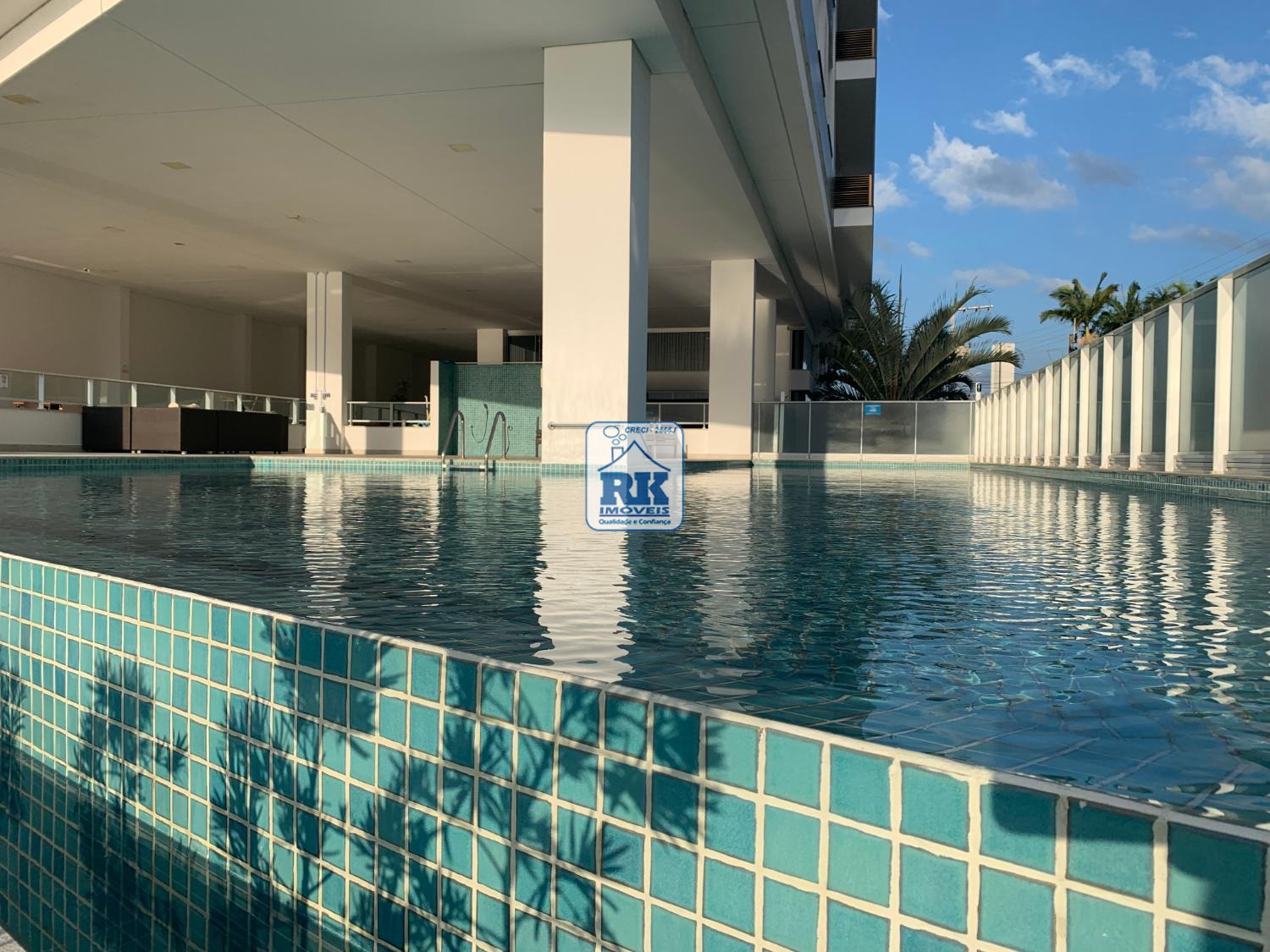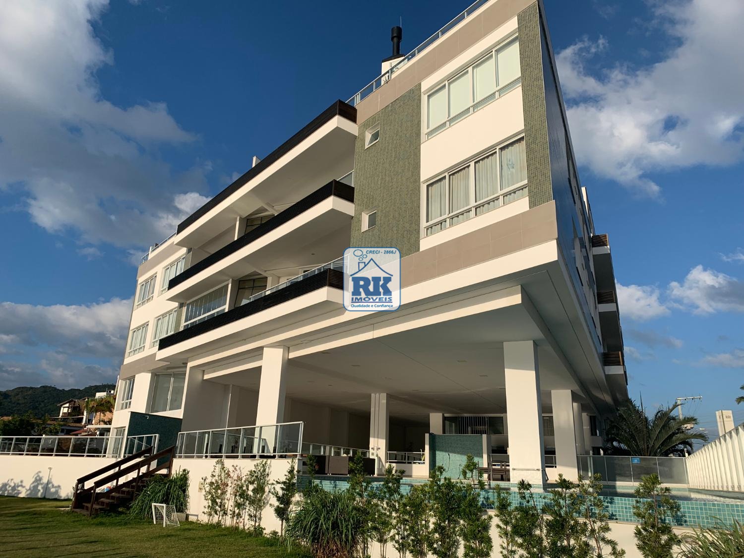 Condomínio frente mar com piscina, salão de festas e sala de jogos.